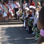 13 A girl hurries to school with flowers to give to the teacher in recognition of the school year just completed